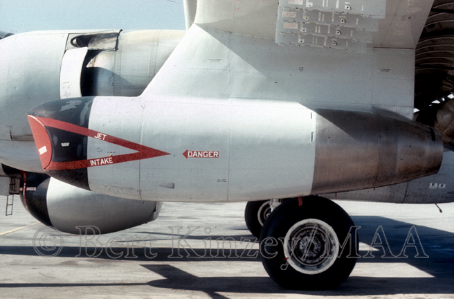 Following delivery, most P2V-5s had a Westinghouse J34-WE-34 turbojet engine added under each wing and were redesignated P2V-5Fs. In order to make room for these engines, four of the rocket stubs under each wing had to be removed. It should be noted that the jet engines were not running all the time, but were used to provide extra power on take-off and when needed during the flight. To make best use of the increased speed provided by the two jet engines, the top turret and the Emerson nose turret were removed. The latter was replaced with a clear observation nose cone. The addition of a long “stinger” tail boom to the aft fuselage also eliminated the tail guns, leaving the aircraft without any defensive armament. The tail boom housed magnetic anomaly detection (MAD) gear. In 1962, P2V-5Fs still in the inventory were redesignated P-2Es.